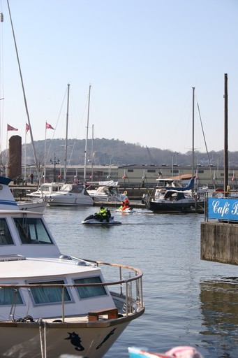 Vi var nere i hamnen och fikade då det kom förbi några vattenskotrar i hamnen. Verkade lite fel årstid(3 april) att åka vattenskoter.